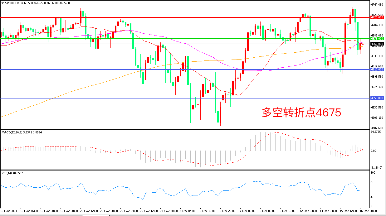 4小时图看,标普500自高位长阴回落,宽幅震荡迹象明显,均线系统粘合形成支撑,4675成为多空分水岭,MACD绿柱缩短,日内震荡上行概率较大。