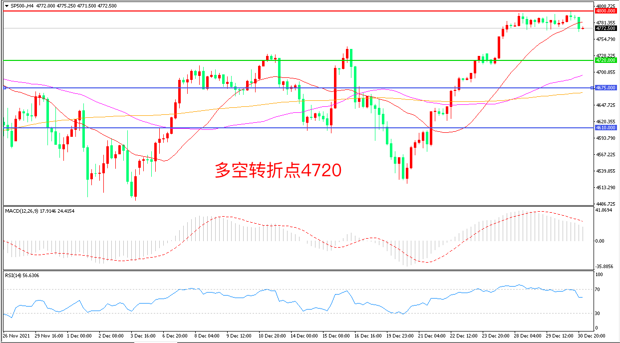 4小时图看,标普500受制于4800一线阻力,短线走势陷入震荡,均线系统逐渐走平, MACD红柱缩短,RSI指标走平,日内延续震荡概率较大。