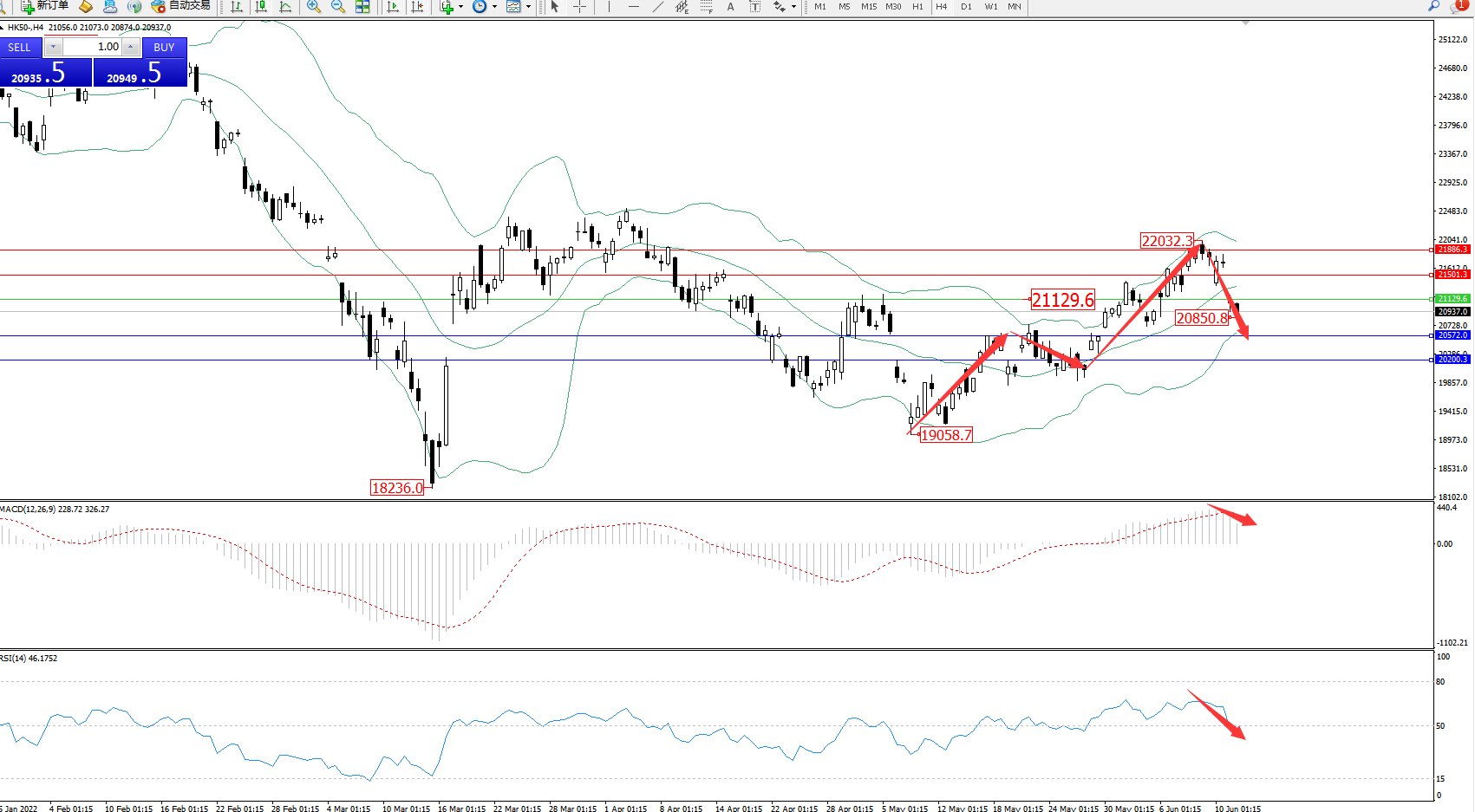 香港恒生指数6月13日(周一)收盘下跌738.6点,跌幅3.39%,报21067.58点;美通胀爆表,市场忧虑加息压力增大,全球金融市场承压。港股全线大跌,恒指险守21000点,恒生科技指数更是大跌4.72%,失守4600点。前期连续反弹的科技股领衔下挫,阿里巴巴跌约8%。